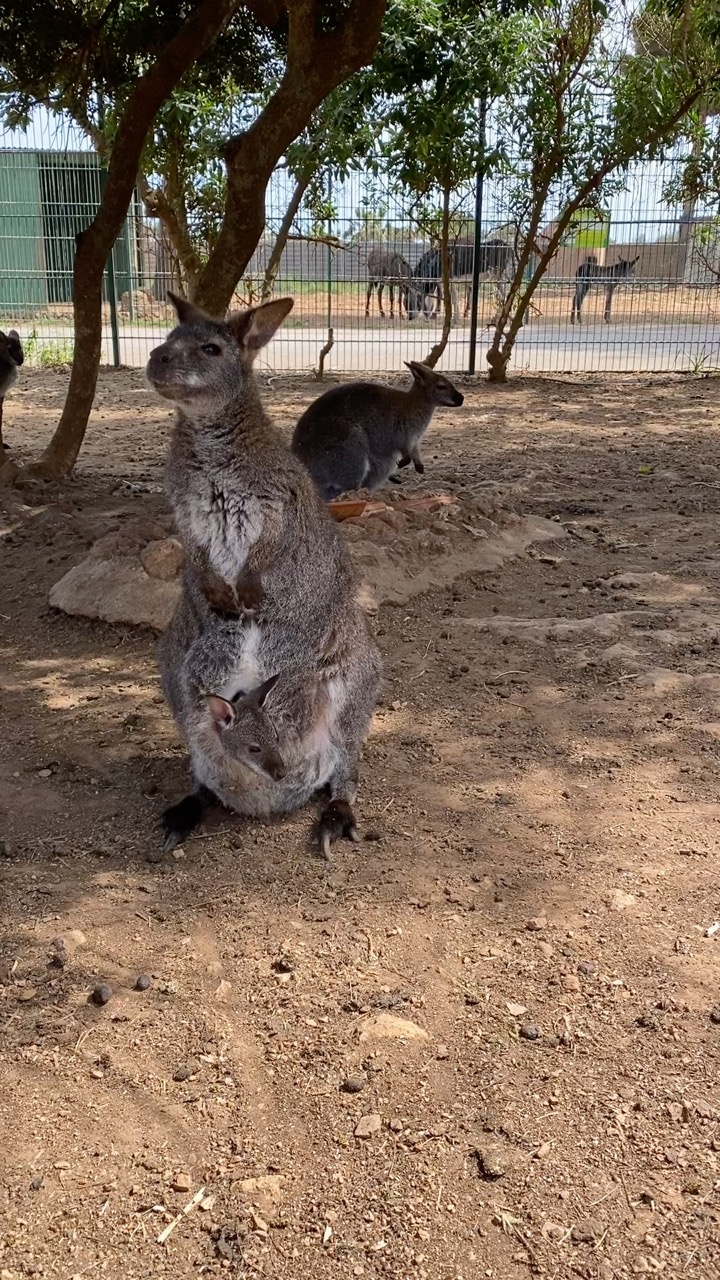 In einem ruhigen, sonnenbeschienenen Gehege steht ein Känguru aufmerksam auf dem staubigen Boden, während sein Junges sicher aus dem Beutel schaut. Der sanfte Schatten der nahegelegenen Bäume bietet eine Erholung von der warmen mediterranen Sonne, die typisch für Mallorca ist. Im Hintergrund umschließt ein Zaun das Gebiet, während andere Kängurus gemütlich ruhen oder grasen. Die Atmosphäre ist ruhig und natürlich, mit den erdigen Tönen des Bodens, die sich von den sanften, gedämpften Grautönen und Brauntönen des Fells der Kängurus abheben. Die Szene ist friedlich und fängt einen Moment der stillen Koexistenz in dieser ruhigen Umgebung ein.