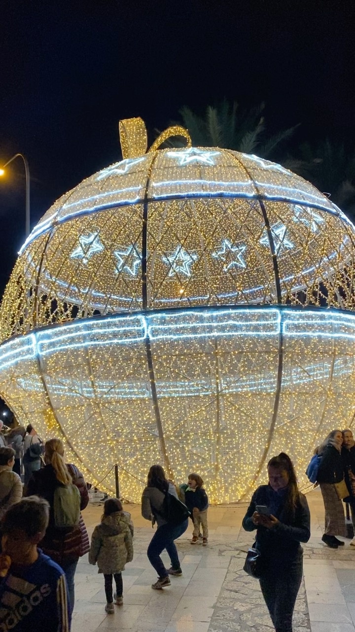 Im Herzen eines lebhaften Platzes in Mallorca, Spanien, steht eine riesige, beleuchtete Kugel als Mittelpunkt und wirft ein warmes, goldenes Licht auf das Kopfsteinpflaster. Das filigrane Design der Kugel ist mit schimmernden Sternen verziert und schafft eine festliche Atmosphäre. Der Nachthimmel darüber ist tief und klar, sodass die Lichter hell leuchten können. Rund um die Kugel versammeln sich Menschen jeden Alters, einige halten inne, um das Spektakel zu bewundern, während andere den Moment mit ihren Geräten festhalten. Die Szene ist lebhaft und geschäftig, mit dem fröhlichen Geplapper von Familien und Freunden, das die Luft erfüllt und den Geist der Feierlichkeit verkörpert.