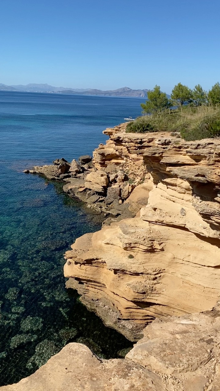 The scene captures a rugged coastline in Mallorca, Spain, where golden sandstone cliffs meet the clear, azure waters of the Mediterranean Sea. The cliffs are layered and textured, with natural formations that have been sculpted by the elements over time. Sparse greenery clings to the top of the cliffs, adding a touch of vibrant green against the earthy tones. The sea is calm, with gentle waves lapping against the rocks, revealing a mosaic of submerged stones beneath the crystal-clear water. In the distance, faint outlines of distant mountains can be seen under a cloudless, bright blue sky, enhancing the serene and tranquil atmosphere of this coastal landscape.