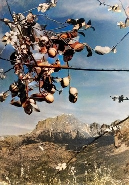 In the serene landscape of Mallorca, Spain, the scene captures the essence of a tranquil spring day. Almond blossoms, delicate and white, contrast with the rich brown of ripening almonds still clinging to their branches. These branches frame a majestic mountain range in the distance, its rugged peaks lightly dusted with snow, under a clear blue sky. The sunlight bathes the scene in a warm glow, highlighting the textures of the rocky terrain and the vibrant colors of the blossoms. This harmonious blend of nature evokes a sense of peace and timeless beauty.