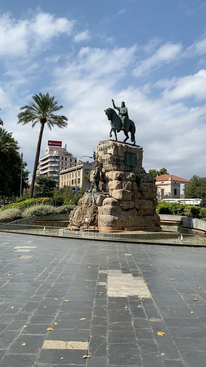 The scene captures a sunlit plaza in Mallorca, Spain, dominated by a striking equestrian statue atop a rugged stone pedestal. The statue, depicting a historical figure on horseback, exudes a sense of grandeur and history. Surrounding the monument is a shallow, circular water feature, adding a tranquil element to the bustling urban setting. The plaza is paved with dark, slightly worn tiles, hinting at frequent foot traffic. To the left, a tall, elegant palm tree sways gently, its silhouette contrasting against the partly cloudy sky. In the background, a mix of modern and traditional buildings line the street, their facades reflecting the island's architectural diversity. The atmosphere is lively yet serene, with the soft rustling of leaves and distant city sounds blending harmoniously.
