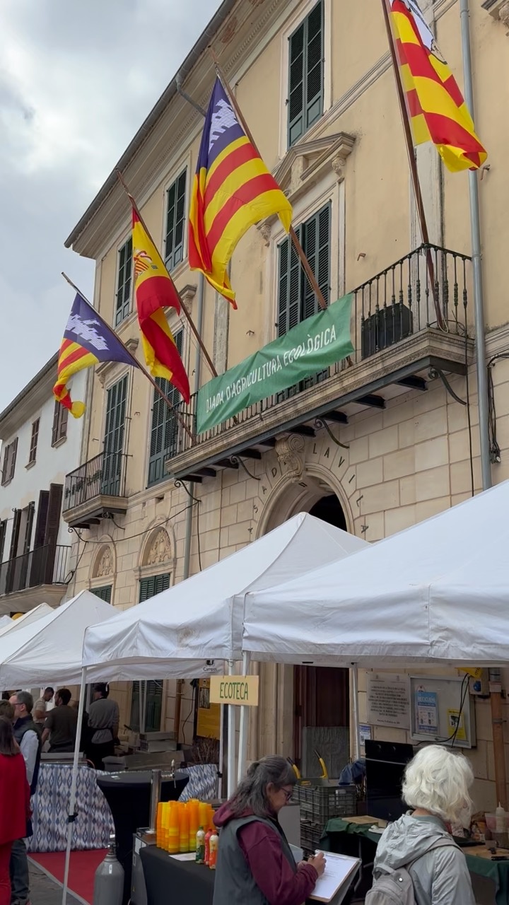 The scene captures a lively market setting in Mallorca, Spain. A historic building with a cream-colored facade and green shutters serves as a backdrop. The architecture features classical elements, including arched windows and a decorative stone entrance. Above, several vibrant flags flutter, their red and yellow hues contrasting against the muted sky. Below, white market tents line the street, bustling with activity. People engage in conversations, and a sign reading 'ECOTECA' hints at an eco-friendly theme. The atmosphere is vibrant yet relaxed, reflecting the island's harmonious blend of tradition and modernity.