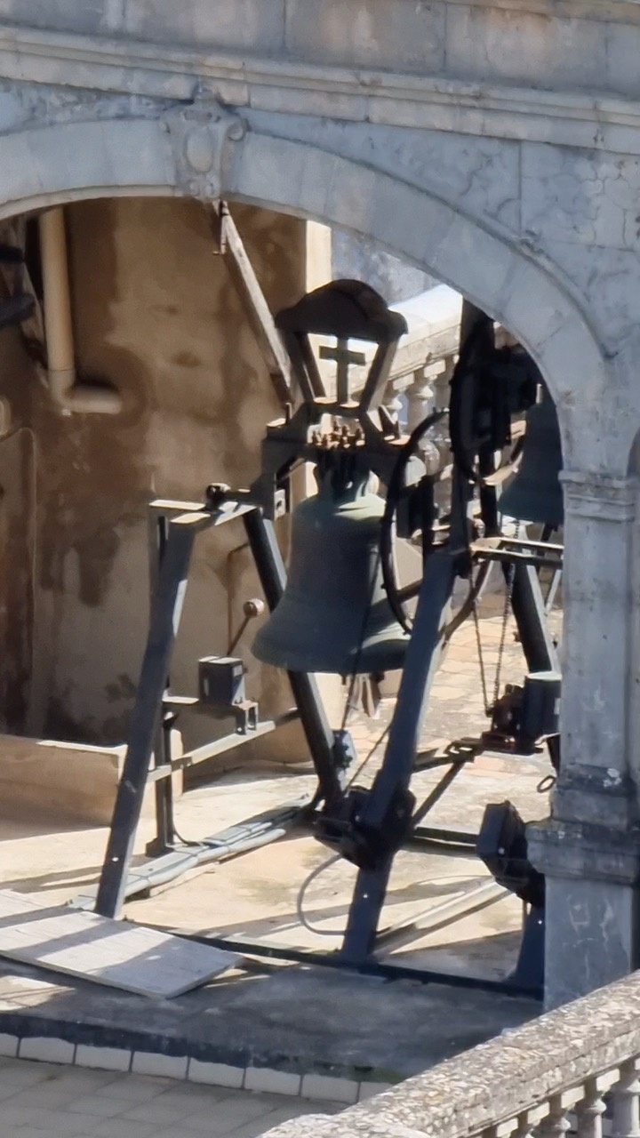 The image captures a historic bell structure set against a backdrop of aged stone architecture, typical of Mallorca, Spain. The bell, housed within a sturdy metal frame, stands prominently under a stone archway, which features intricate carvings and a weathered patina that speaks to its age. The sunlight casts gentle shadows, highlighting the textures of the stone and metal, creating a serene and timeless atmosphere. The surrounding area appears to be part of an old building, with muted earth tones and a sense of quiet elegance, evoking the rich cultural heritage of the region.