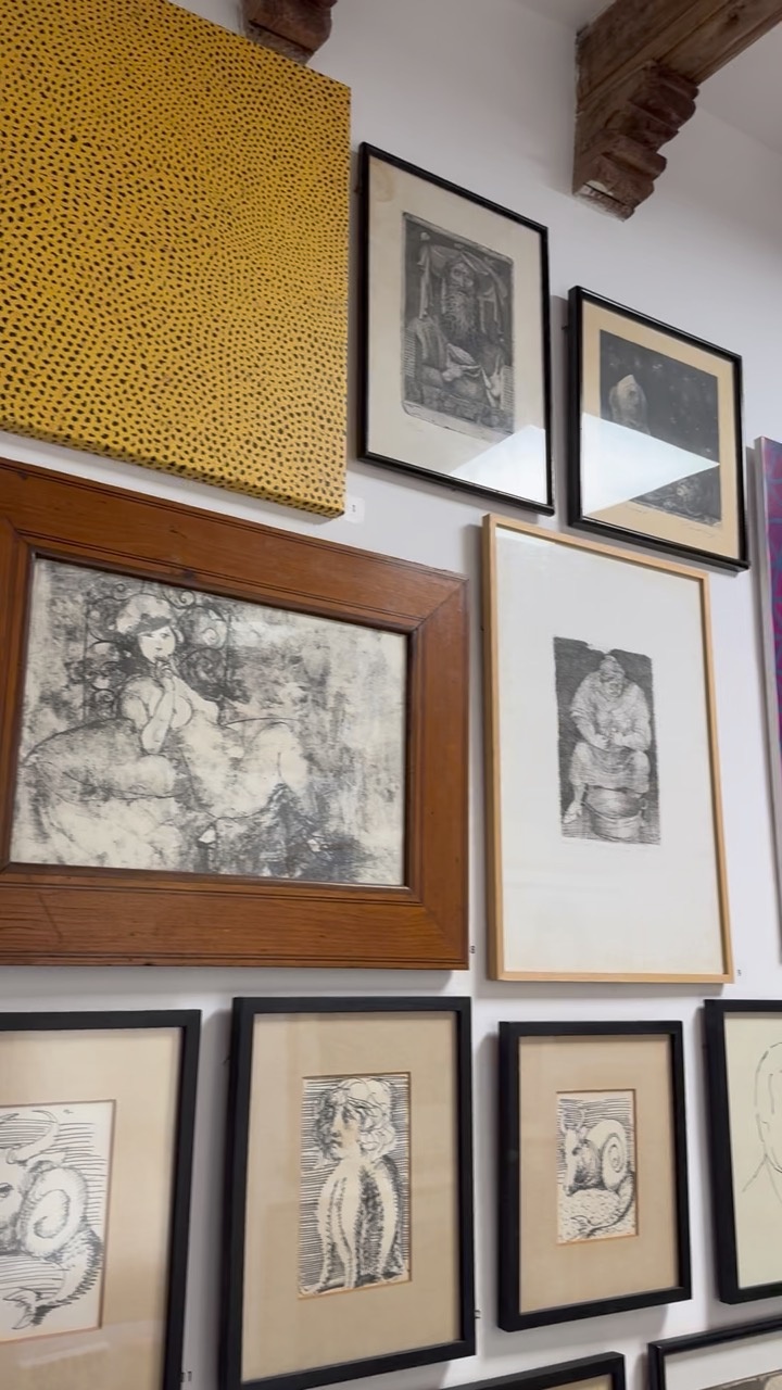 The image showcases a wall adorned with an eclectic collection of framed artworks, each piece contributing to a tapestry of artistic expression. The frames vary in size and style, from simple black borders to more ornate wooden designs, creating a visually engaging mosaic. The artworks themselves range from intricate sketches to abstract patterns, including a striking piece with a yellow dotted pattern that adds a vibrant pop of color. The soft, ambient light in the room highlights the textures and details of the drawings, casting subtle shadows that enhance the depth of each piece. The exposed wooden beam above adds a rustic touch, suggesting a traditional Mallorcan architectural element, and infuses the space with a warm, inviting atmosphere. This setting evokes a sense of cultural richness and artistic appreciation, characteristic of Mallorca's vibrant art scene.