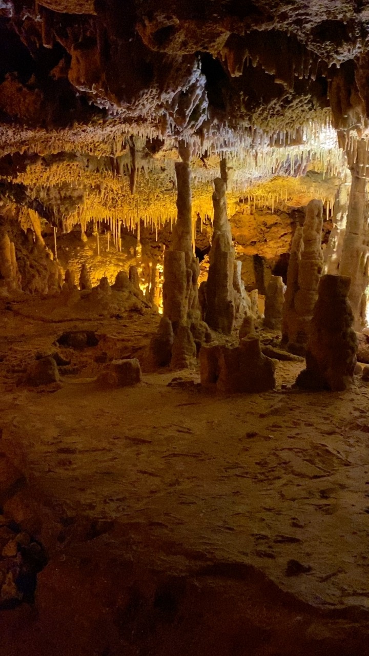 The scene unfolds within a captivating underground cave, where the soft, warm glow of artificial light accentuates the intricate formations of stalactites and stalagmites. The ceiling is adorned with delicate, icicle-like stalactites that hang precariously, casting shadows that dance across the textured surfaces. Below, a forest of stalagmites rises from the cave floor, their rugged surfaces hinting at the slow passage of time. The earthy tones of the rock formations are enriched by the subtle illumination, creating an atmosphere of ancient mystery and natural wonder, typical of Mallorca's subterranean landscapes.