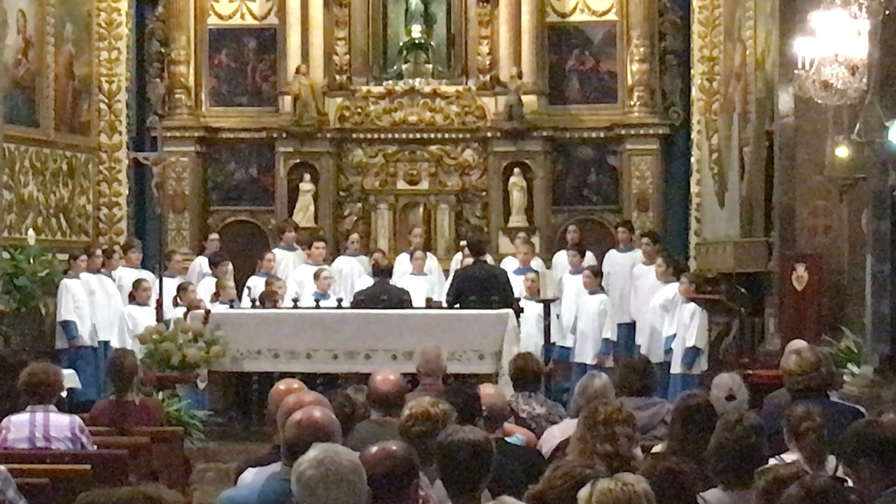 Inside a richly adorned church in Mallorca, Spain, a choir of young singers stands in front of an ornate altar. The altar is intricately decorated with golden carvings and religious iconography, creating a sense of reverence and history. The choir, dressed in white robes with blue accents, is positioned around a simple white-clothed altar table, adding a touch of purity and serenity to the scene. The audience, seated in wooden pews, watches attentively, their faces illuminated by the warm glow of chandeliers overhead. The atmosphere is solemn yet uplifting, with the grandeur of the church's architecture enhancing the spiritual ambiance.