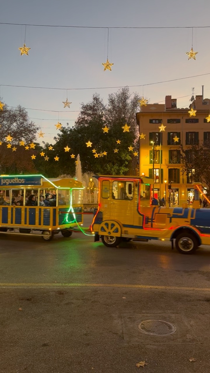 As dusk settles over the charming streets of Mallorca, a vibrant, miniature train adorned with bright yellow and blue hues winds its way through the plaza. The train is illuminated with festive lights, casting a warm glow that reflects off the cobblestone pathway. Above, a canopy of twinkling star-shaped lights adds a whimsical touch to the evening sky, enhancing the magical atmosphere. In the background, a classic Mediterranean building stands with its warm, earth-toned facade, its windows softly lit from within. The gentle rustle of leaves from nearby trees and the distant murmur of a fountain contribute to the serene yet lively ambiance of this picturesque setting.