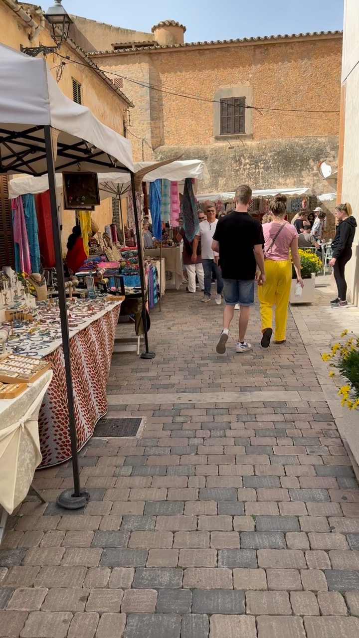 The scene captures a charming street market in Mallorca, Spain, where the warm Mediterranean light bathes the cobblestone path. Vibrant textiles and an array of handcrafted goods adorn the stalls, creating a colorful tapestry against the rustic, sun-kissed walls of the surrounding buildings. The atmosphere is lively yet relaxed, with people leisurely strolling and exploring the market's offerings. The architecture features earthy tones and traditional stonework, enhancing the quaint, historical ambiance of this picturesque locale. A sense of community and tradition permeates the air, as locals and visitors alike enjoy the simple pleasures of a sunny day in this enchanting setting.