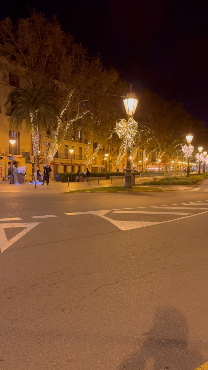 The scene captures a charming street in Mallorca, Spain, illuminated by warm, golden streetlights that cast a soft glow over the surroundings. Tall trees line the avenue, their trunks wrapped in twinkling white lights, adding a festive sparkle to the night. The buildings, with their classic Mediterranean architecture, stand gracefully along the street, their facades subtly lit by the ambient light. A few people are visible, strolling leisurely, adding a sense of calm and evening relaxation. The atmosphere is serene and inviting, with a hint of holiday cheer in the air.