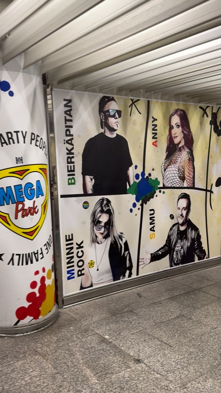 La imagen captura una exhibición promocional vibrante y animada en un lugar en Mallorca, España. El entorno es un área interior bulliciosa, posiblemente parte de un complejo de vida nocturna o entretenimiento. La pared presenta carteles coloridos con gráficos audaces y nombres, sugiriendo una atmósfera dinámica y enérgica. El suelo está hecho de baldosas de piedra texturizadas, añadiendo un toque de encanto rústico que contrasta con el diseño moderno y llamativo de los carteles. La iluminación es brillante, realzando los colores vivos y creando un ambiente animado y acogedor típico del espíritu festivo de Mallorca.