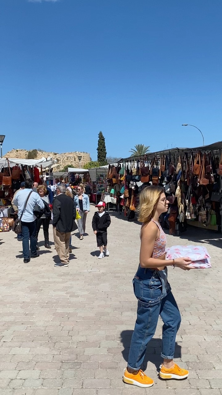 Bajo un cielo azul claro, se despliega una bulliciosa escena de mercado en Mallorca, España. La luz del sol baña el camino de adoquines, proyectando suaves sombras mientras las personas pasean tranquilamente entre los puestos adornados con una variedad de artículos de cuero. Los tonos cálidos de la mercancía contrastan con la vestimenta vibrante de los visitantes, creando una atmósfera animada. En el fondo, el paisaje accidentado y un solitario ciprés insinúan la belleza natural de la isla, mientras que las distantes estructuras de piedra añaden un toque de encanto histórico. El ambiente general es animado y acogedor, capturando la esencia de un mercado mediterráneo.