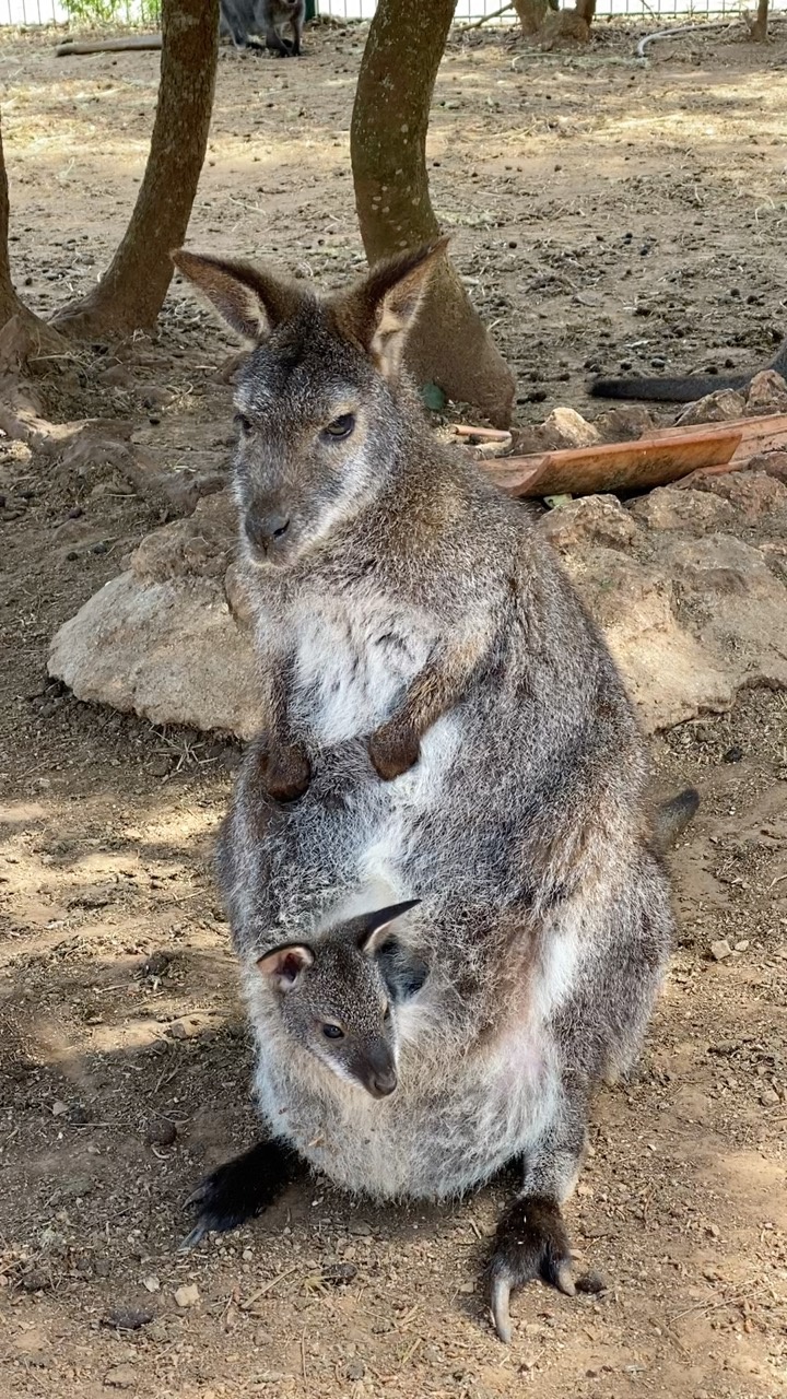 En un área serena y salpicada de sol, un canguro se encuentra sobre un suelo terrenal, su pelaje es una mezcla de grises y marrones suaves que armonizan con el entorno natural. La luz filtra suavemente a través del escaso dosel arriba, proyectando sombras delicadas que bailan sobre el suelo texturizado. Acurrucado de manera segura en la bolsa del canguro, un pequeño canguro asoma con ojos curiosos, añadiendo una dinámica tierna a la escena. La atmósfera es calma y acogedora, reflejando la ambientación tranquila típica de los lugares más apartados de Mallorca. La presencia de árboles cercanos proporciona una sensación de refugio y continuidad con el paisaje, realzando la sensación de coexistencia pacífica con la naturaleza.