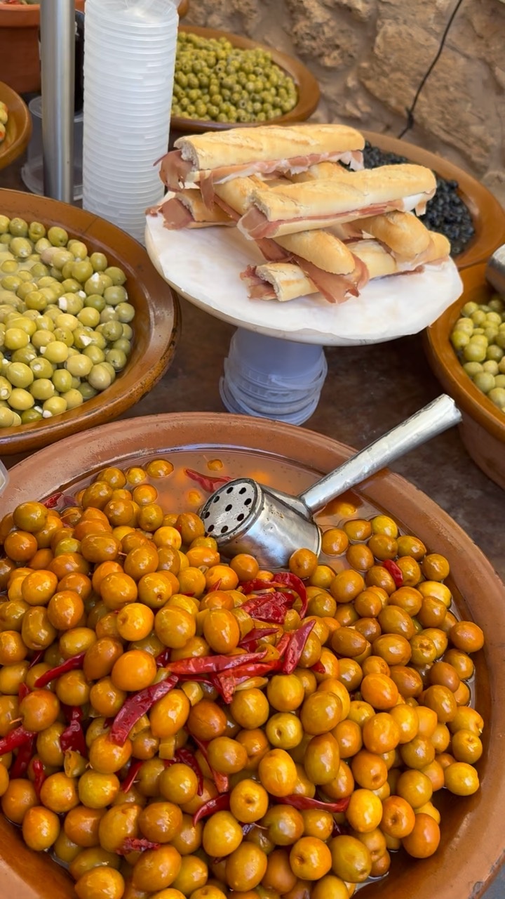 In the warm, sunlit ambiance of a Mallorcan market, an inviting display of local delicacies captures the eye. The scene is dominated by large terracotta bowls brimming with vibrant olives, their glossy surfaces reflecting the soft Mediterranean light. A mix of green and golden hues, the olives are accompanied by slivers of bright red peppers, adding a pop of color and hinting at a spicy flavor. Nearby, a marble platter holds rustic sandwiches filled with slices of cured meat, their crusty bread contrasting with the smooth texture of the olives. The rustic stone wall in the background adds to the authentic, earthy feel of the setting, evoking the rich culinary traditions of Mallorca.
