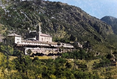 Nestled against the rugged backdrop of a mountainous landscape, a historic monastery stands prominently with its stone facade reflecting the warm Mediterranean sun. The structure is characterized by its traditional architecture, featuring a bell tower that rises elegantly above the complex. Surrounding the monastery, terraced gardens and lush greenery cascade down the hillside, adding vibrant shades of green to the scene. The atmosphere is serene and timeless, capturing the essence of Mallorca's tranquil countryside. The mountains, with their craggy textures and earthy tones, create a dramatic contrast against the clear blue sky, enhancing the peaceful and secluded ambiance of this picturesque setting.