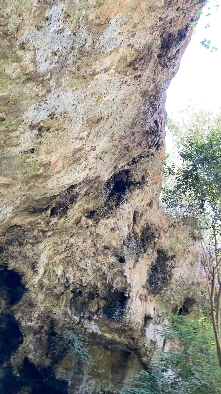 The photo captures a rugged rock face, likely part of a natural cliff or cave formation. The surface is textured with various shades of brown and gray, indicating weathering and natural erosion. Sparse vegetation, including small trees and shrubs, is visible at the base, suggesting a natural outdoor setting. The mood is serene and untouched, evoking a sense of exploration and adventure. The lighting is natural, with shadows indicating overhead sunlight, enhancing the textures of the rock.