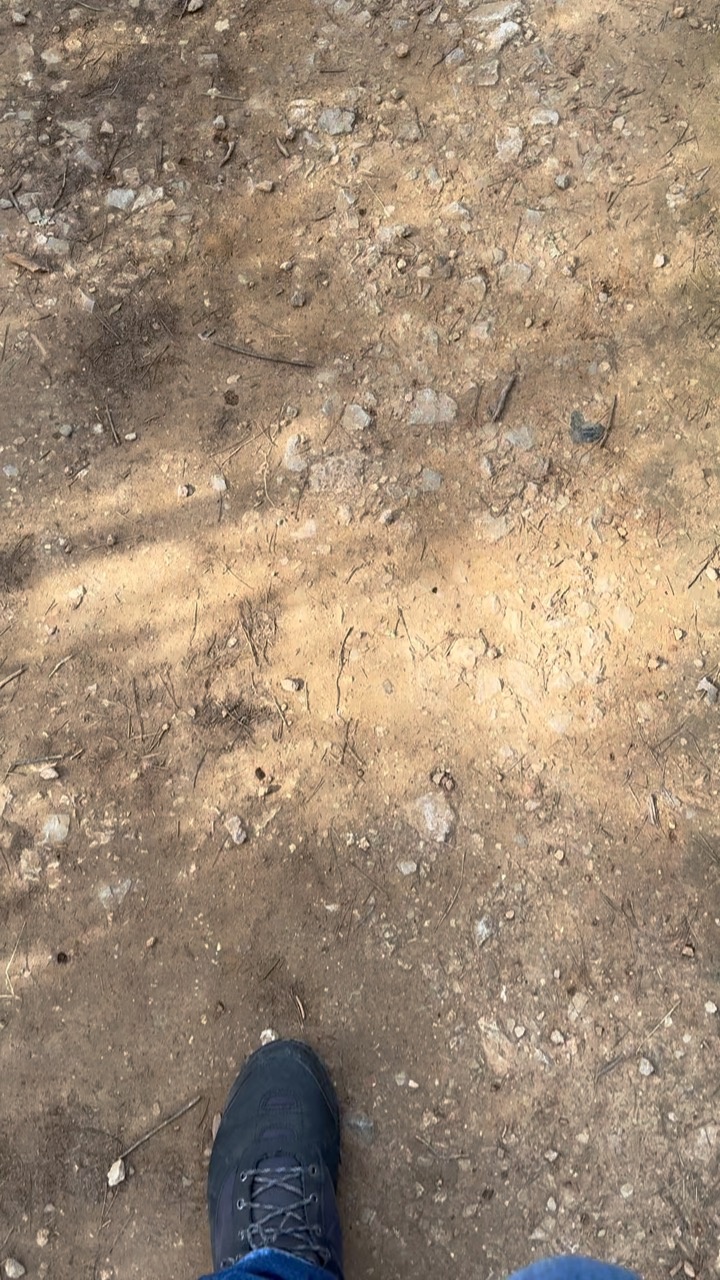 The image shows a close-up view of a dirt path with a single shoe visible, suggesting someone is walking or hiking. The ground is uneven and covered with small rocks and pebbles, indicating a natural, possibly rural setting. Sunlight filters through, casting shadows on the path, which adds a warm and tranquil mood to the scene. The shoe appears to be a hiking boot, suggesting the person is on a trail or outdoor adventure. The overall context implies a casual, relaxed exploration of nature.