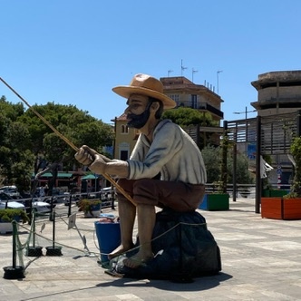Under the bright, cloudless sky of Mallorca, a large, whimsical sculpture of a fisherman sits prominently on a sunlit plaza. The figure, with a broad-brimmed hat and a focused expression, is poised with a fishing rod, seemingly casting into an imaginary sea. His attire, a blend of earthy tones, complements the natural stone texture of the plaza, which is bordered by lush greenery and vibrant planters. In the background, a mix of modern and traditional architecture rises, with buildings featuring flat roofs and balconies, hinting at the island's blend of old-world charm and contemporary life. The atmosphere is lively yet relaxed, typical of a Mediterranean town square.