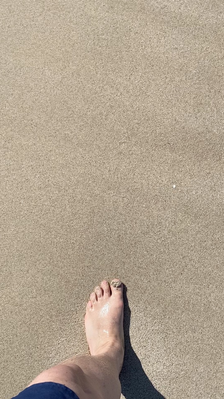 A single foot steps onto the soft, golden sand, glistening under the bright Mediterranean sun. The texture of the sand is fine and smooth, capturing the warmth of the day. The foot, slightly wet, suggests a recent encounter with the gentle waves of the sea nearby. Shadows cast by the sun create a subtle contrast, highlighting the contours of the sand and the foot. The atmosphere is serene and inviting, typical of a tranquil day on a Mallorcan beach.