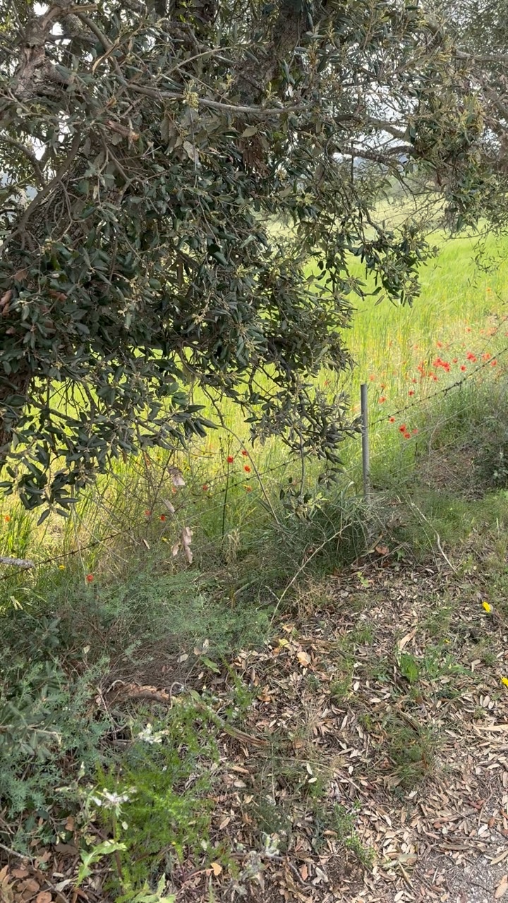 A serene countryside scene in Mallorca, Spain, featuring a lush, green landscape. The foreground is dominated by a gnarled tree with dense, dark leaves, casting gentle shadows on the ground. Beneath the tree, a variety of wild plants and grasses create a textured undergrowth, interspersed with fallen leaves. In the background, a field of vibrant green grass stretches out, dotted with delicate red poppies that add a splash of color. A simple wire fence runs alongside the field, blending into the natural surroundings. The atmosphere is tranquil, evoking a sense of peaceful solitude typical of the Mediterranean countryside.