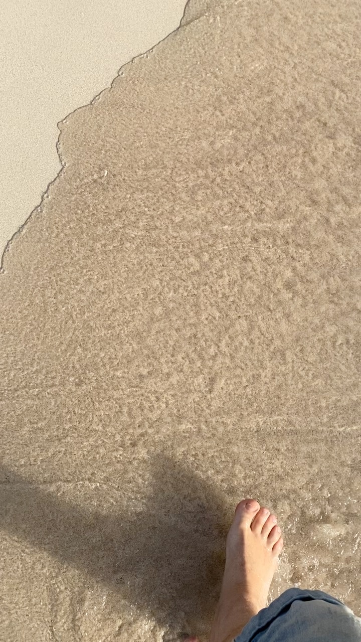 A single bare foot gently touches the edge of a sunlit, sandy beach in Mallorca, Spain. The sand is fine and golden, with a subtle sheen from the shallow, clear water that laps softly at the shore. The light casts a warm glow, enhancing the tranquil and inviting atmosphere typical of a Mediterranean coastline. The gentle textures of the sand and water create a soothing visual harmony, evoking a sense of relaxation and connection with nature.