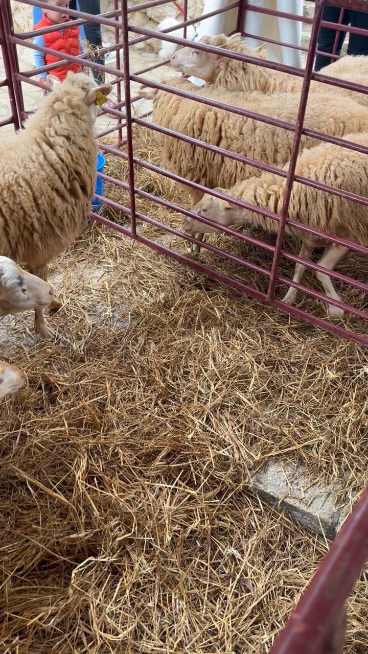 In a rustic setting typical of Mallorca, Spain, a group of sheep is gathered within a metal pen. The sheep's woolly coats are thick and textured, blending harmoniously with the straw-laden ground beneath them. The pen's red metal bars are sturdy and weathered, hinting at frequent use. The atmosphere is calm, with a sense of pastoral tranquility, as the sheep mill about leisurely. The presence of people nearby, partially visible, suggests a communal or market environment, where the local culture and agricultural traditions are alive and thriving.