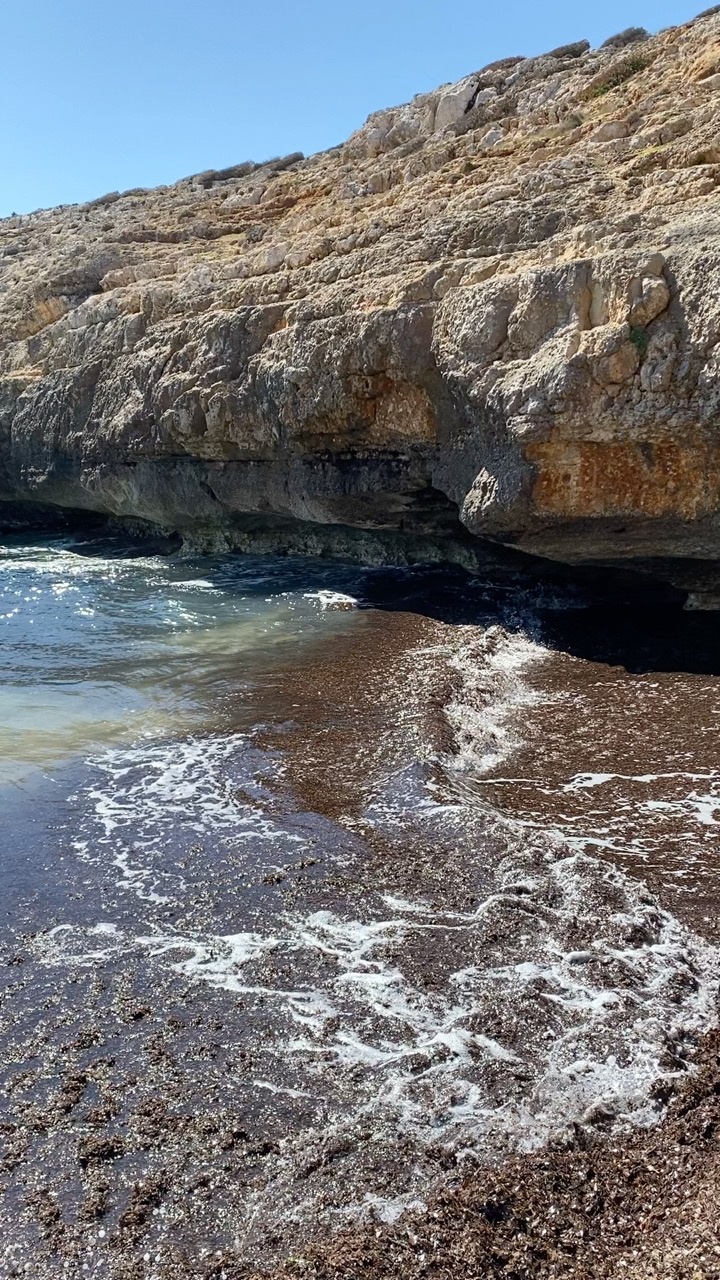 The scene captures a rugged coastal landscape in Mallorca, Spain, where the sunlight bathes the rocky cliffs in warm hues of beige and ochre. The textured surface of the cliffs contrasts with the gentle waves lapping against the shoreline, creating a rhythmic pattern of white foam on the dark, pebbly beach. The clear blue sky above enhances the serene and natural beauty of the setting, evoking a sense of tranquility and timelessness.