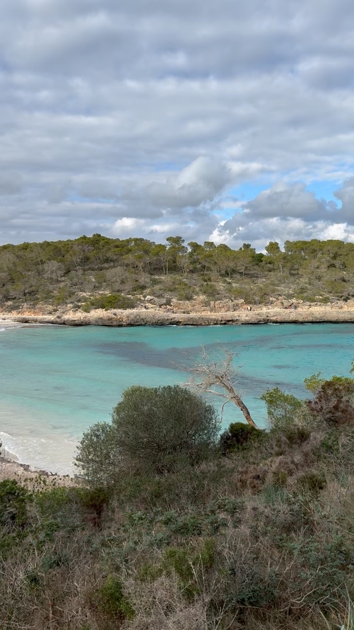 The scene captures a tranquil bay in Mallorca, Spain, where the turquoise waters gently meet the sandy shore. The coastline is framed by rugged cliffs and dense, green vegetation, creating a natural barrier between the beach and the inland forest. The sky is overcast with thick, rolling clouds, casting a soft, diffused light over the landscape, enhancing the serene and peaceful atmosphere. Sparse trees and bushes populate the foreground, their leaves rustling subtly in the gentle breeze.