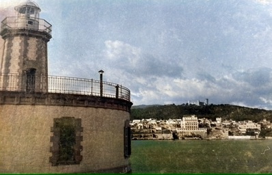 The image captures a serene coastal scene in Mallorca, Spain. A lighthouse stands prominently on the left, its stone facade weathered by the sea air, topped with a metal railing and a lantern room. The sky above is partly cloudy, casting a soft, diffused light over the landscape. Across the water, a collection of white and beige buildings lines the shore, their facades reflecting the island's architectural charm. In the background, lush green hills rise gently, adding depth to the scene. The overall atmosphere is tranquil, with a gentle breeze suggested by the calmness of the water.