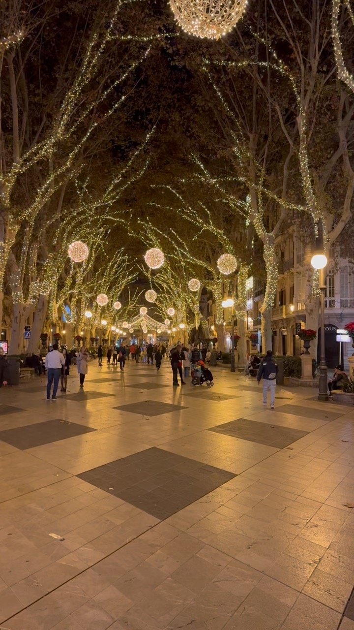 The scene captures a lively, illuminated street in Mallorca, Spain, where the night sky is softly aglow with warm, golden lights. Tall trees line the avenue, their branches intricately wrapped in twinkling lights, creating a canopy of shimmering beauty. Large, glowing orbs hang overhead, adding a festive touch to the atmosphere. The street is bustling with people strolling leisurely, some pausing to admire the enchanting display. The ground is paved with large, smooth tiles, reflecting the ambient light and adding a sense of warmth to the scene. The surrounding buildings, with their elegant facades, frame the lively promenade, enhancing the inviting and vibrant mood of the evening.