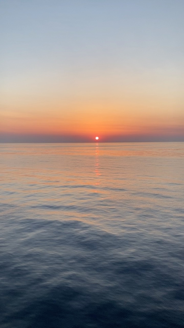 The image captures a serene sunset over the Mediterranean Sea, as seen from the coast of Mallorca, Spain. The sky transitions from a soft blue at the top to a warm gradient of orange and pink near the horizon, where the sun is setting. The sun casts a gentle reflection across the calm, rippling water, enhancing the tranquil atmosphere. The scene evokes a sense of peace and natural beauty, characteristic of a quiet evening by the sea.