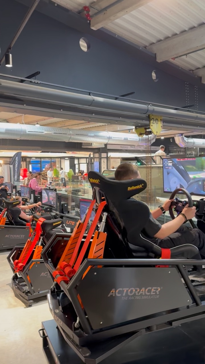 The scene captures an indoor racing simulator area, where individuals are deeply engaged in virtual racing experiences. The simulators are sleek, with a combination of black and vibrant orange accents, creating a dynamic and modern aesthetic. The lighting is bright and evenly distributed, casting a clear view over the simulators and participants. In the background, a glass partition separates the racing area from a bustling section of the venue, where people can be seen interacting and enjoying the atmosphere. The industrial-style ceiling with exposed ducts adds a contemporary touch, blending with the lively and energetic ambiance typical of a recreational space in Mallorca.