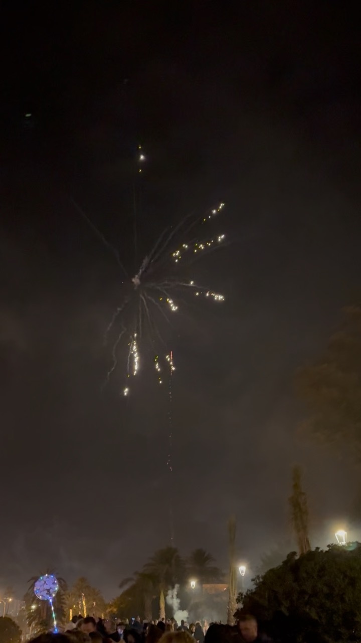 The night sky over Mallorca is illuminated by a burst of fireworks, casting a warm glow over the scene. The fireworks create delicate trails of light against the dark, cloudy sky, adding a festive atmosphere. Below, a crowd of people gathers, their silhouettes visible in the dim light. Palm trees and other vegetation are faintly outlined, contributing to the coastal ambiance typical of this Mediterranean island. The overall mood is lively and celebratory, with the soft lighting from street lamps adding to the intimate feel of the gathering.