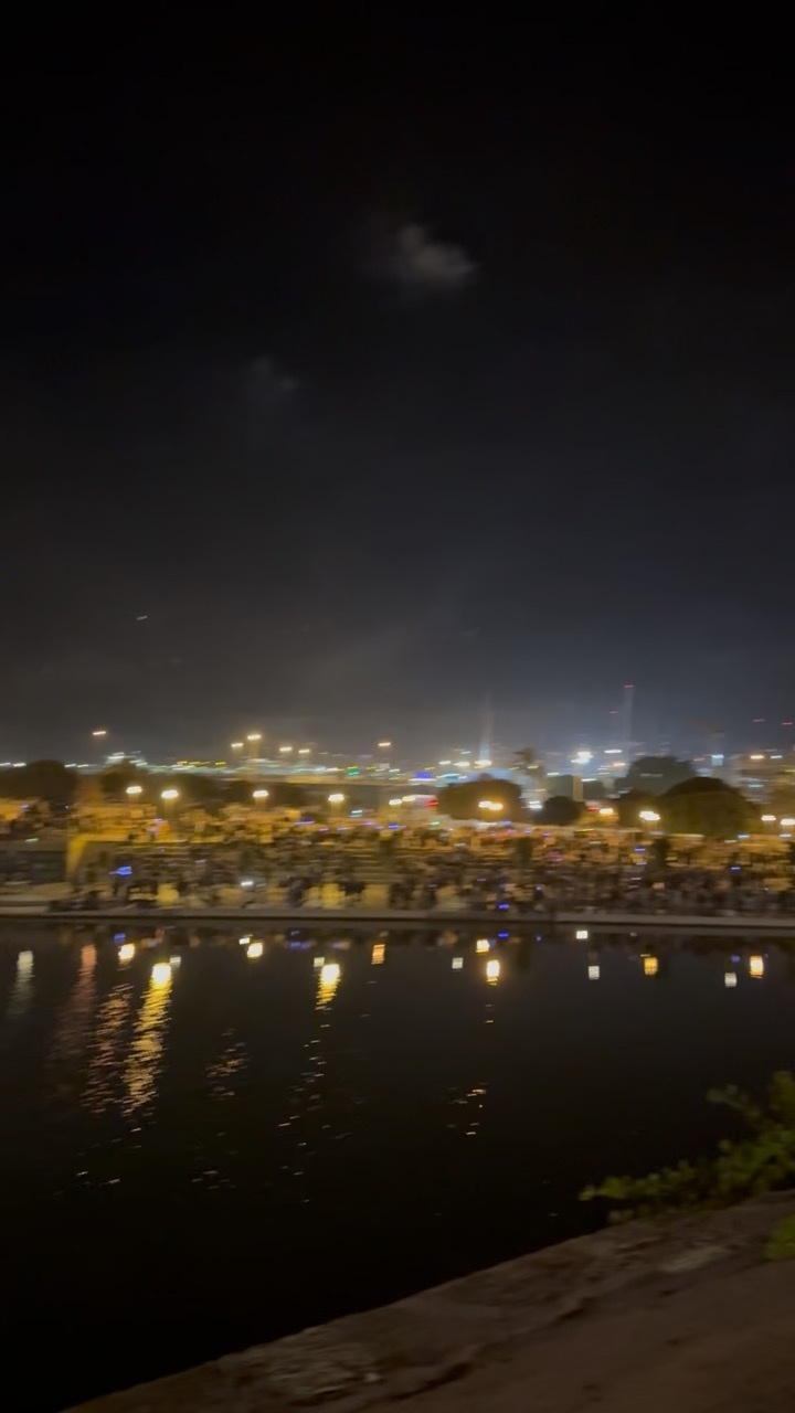 The scene captures a lively night in Mallorca, Spain, where the warm glow of street lamps casts a golden hue over a bustling waterfront area. Reflections dance on the calm, dark water, creating a shimmering effect that enhances the vibrant atmosphere. In the background, the soft outlines of trees and distant structures are visible, subtly illuminated by the ambient city lights. The sky is a deep, velvety black, with a hint of clouds, adding to the serene yet dynamic mood of the evening. The gathering of people suggests a festive or social event, contributing to the lively energy of the scene.