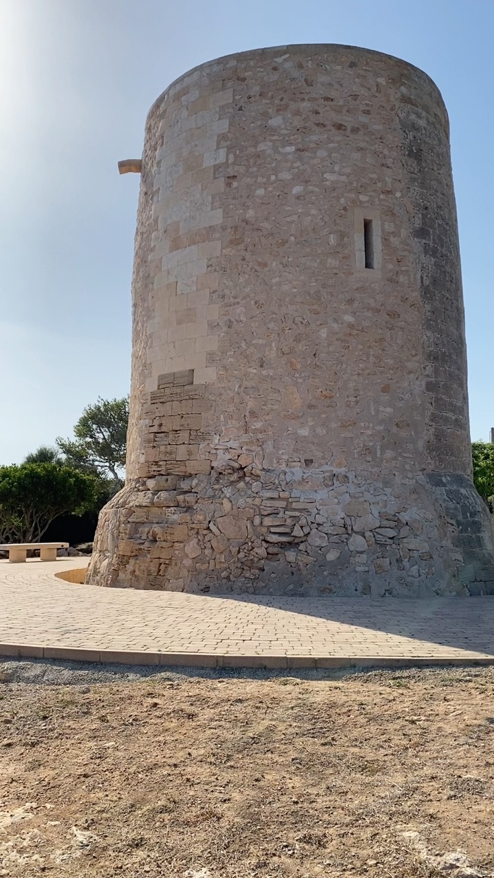 The scene captures an ancient stone tower standing robustly against a clear blue sky, characteristic of Mallorca's historical architecture. The tower's surface is textured with weathered stones, showcasing varying shades of beige and gray, hinting at its long-standing presence. Surrounding the base is a paved area with light-colored stones, contrasting with the dry, earthy ground nearby. Sparse greenery, including a few trees, frames the structure, adding a touch of natural beauty. The warm sunlight casts soft shadows, enhancing the tranquil and timeless atmosphere of the setting.