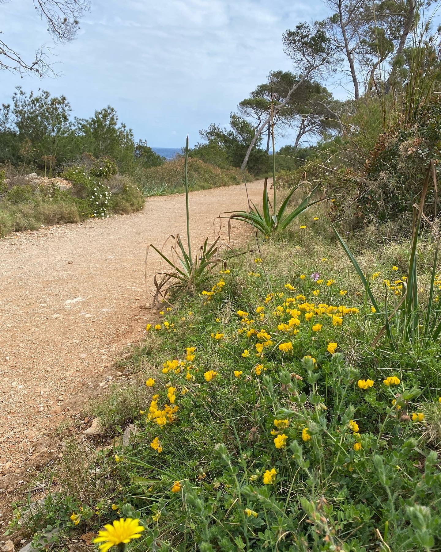 A serene, winding path stretches through a lush, natural landscape, typical of Mallorca's rustic charm. The path is composed of a light, earthy gravel that contrasts with the vibrant greenery flanking it. On the right, a cluster of bright yellow wildflowers punctuates the verdant grass, adding a cheerful splash of color. Tall, slender trees with sparse foliage sway gently in the breeze, their silhouettes outlined against a soft, cloudy sky. In the distance, hints of the deep blue sea peek through the vegetation, suggesting the proximity of the coast. The overall atmosphere is tranquil and inviting, capturing the essence of a leisurely stroll in the Mediterranean countryside.