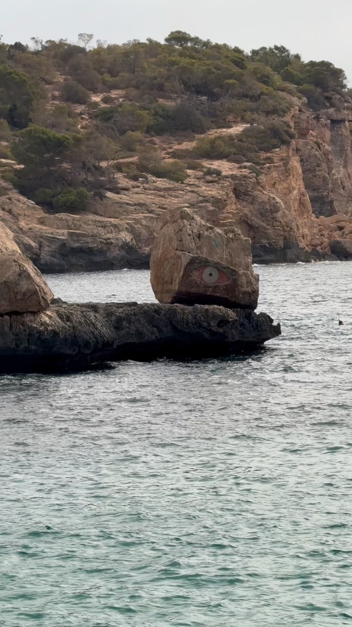 The scene captures a rugged coastal landscape in Mallorca, Spain, where the rocky shoreline meets the gentle waves of the sea. A prominent boulder juts out from the dark, textured rock formations, adorned with a painted eye that adds an unexpected artistic touch to the natural setting. The sea is a serene turquoise, its surface rippling softly under the overcast sky, which casts a muted light over the scene. In the background, the cliffs are covered with patches of green vegetation, hinting at the island's Mediterranean flora. The atmosphere is tranquil and slightly mysterious, evoking a sense of timelessness and natural beauty.