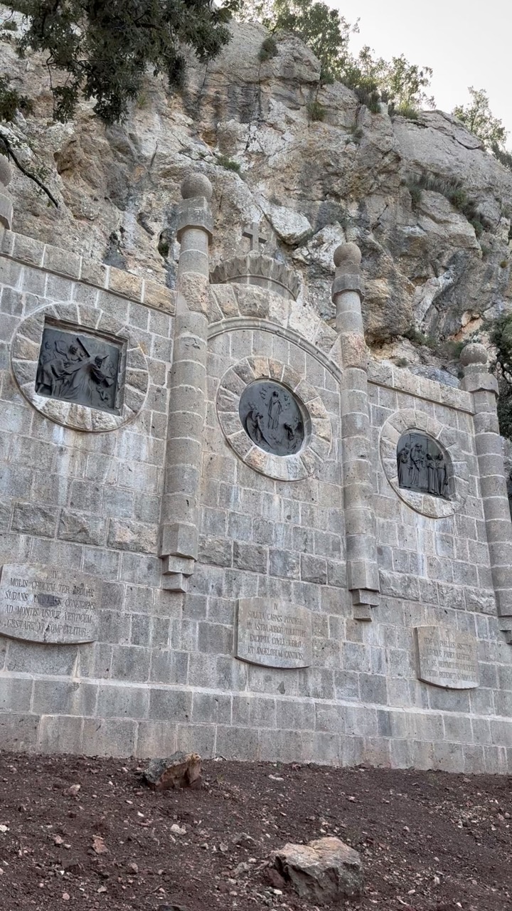The scene captures a stone wall built into a rugged cliffside, showcasing a blend of natural and architectural beauty typical of Mallorca, Spain. The wall is adorned with three circular relief sculptures, each intricately carved and framed by the textured stone. The stonework displays a weathered patina, suggesting historical significance. Above, the cliff's surface is rough and jagged, with sparse vegetation clinging to its crevices, adding a touch of greenery to the otherwise earthy tones. The atmosphere is serene, with a sense of timelessness, as the structure stands quietly against the backdrop of the rocky landscape, evoking a feeling of reverence and history.
