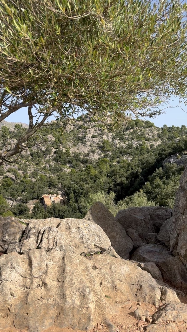 The scene captures a rugged, rocky landscape typical of Mallorca, with sunlit stones in the foreground casting soft shadows that hint at the warm Mediterranean climate. An ancient, weathered building peeks through a dense tapestry of olive trees and lush greenery, nestled against a backdrop of rolling hills. The foliage is vibrant, with the olive tree's silvery leaves gently rustling in the breeze, adding a sense of tranquility. The clear blue sky above enhances the serene and timeless atmosphere of this secluded natural retreat.