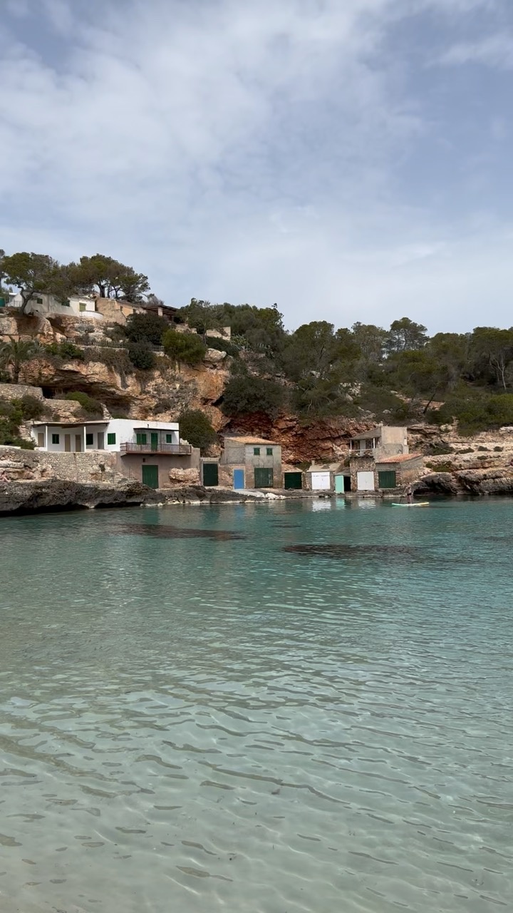 Nestled along the rugged coastline of Mallorca, the scene captures a serene cove with clear, turquoise waters gently lapping against the rocky shore. The small, rustic boathouses, painted in muted shades of white, green, and blue, blend harmoniously with the earthy tones of the surrounding cliffs. Pine trees dot the landscape, adding a touch of greenery to the rocky terrain. The sky is a soft, overcast gray, casting a diffused light that enhances the tranquil and secluded atmosphere of this coastal retreat.