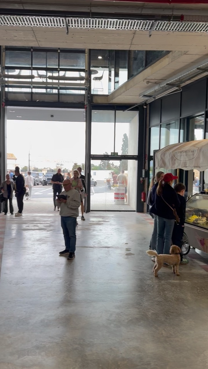 The photo captures a bustling indoor market scene with people casually walking and browsing. A small group is gathered around a stall on the right, possibly looking at food items. The atmosphere is lively yet relaxed, with natural light streaming in from the large open entrance. A dog is seen standing near its owner, adding to the friendly and welcoming vibe. The architecture is modern with concrete floors and high ceilings, suggesting a contemporary urban setting. The presence of outdoor elements visible through the entrance hints at a connection between the indoor market and the surrounding environment.