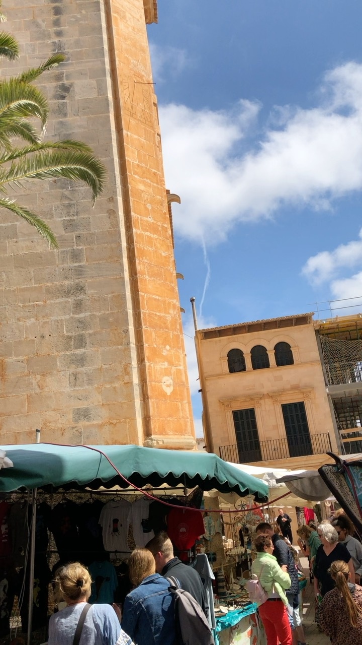 The scene captures a lively market atmosphere set against the backdrop of Mallorca's charming architecture. The warm, golden hues of the sunlit stone buildings reflect the Mediterranean light, creating a vibrant contrast with the clear blue sky adorned with scattered, fluffy clouds. A tall, rustic building with weathered textures stands prominently, its surface showing the passage of time. Below, a bustling market thrives with people casually browsing stalls shaded by colorful canopies. The presence of a palm tree adds a touch of the island's natural beauty, swaying gently in the soft breeze. The mood is lively and inviting, embodying the essence of a sunny day in a picturesque Spanish locale.