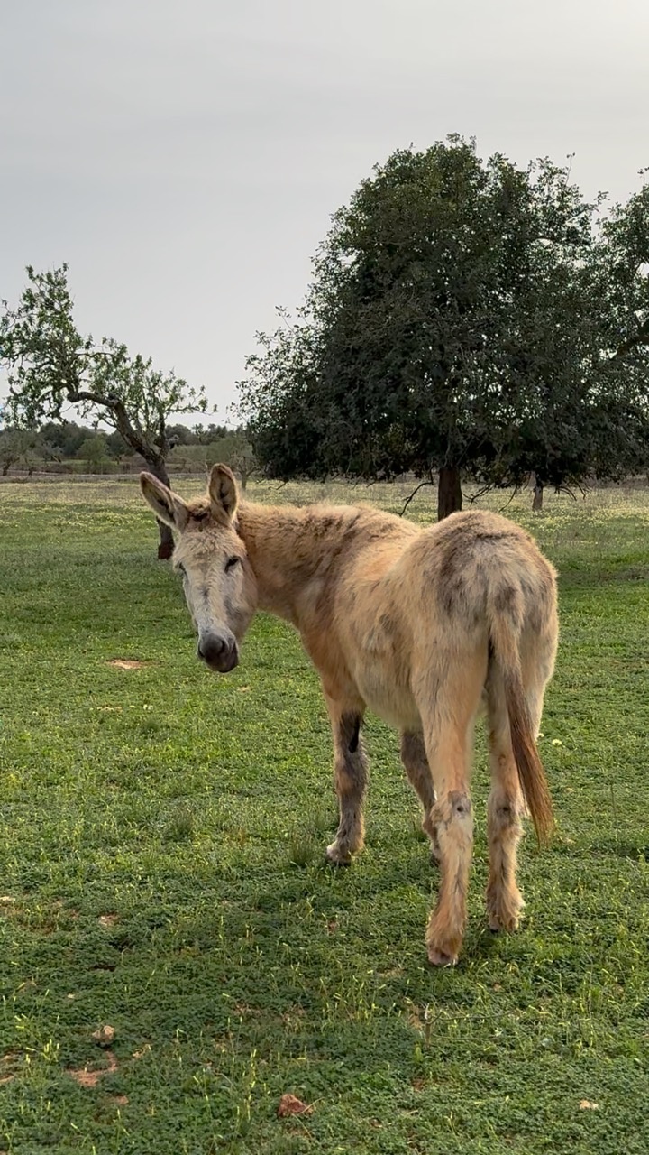 In the serene countryside of Mallorca, a gentle donkey stands on a lush green field, its coat a mix of earthy browns and soft grays. The landscape is dotted with mature trees, their branches reaching outwards, casting delicate shadows on the grass. The sky above is overcast, creating a soft, diffused light that enhances the tranquil mood of the scene. The donkey, with its calm demeanor, seems to be a natural part of this idyllic rural setting, embodying the peaceful simplicity of island life.