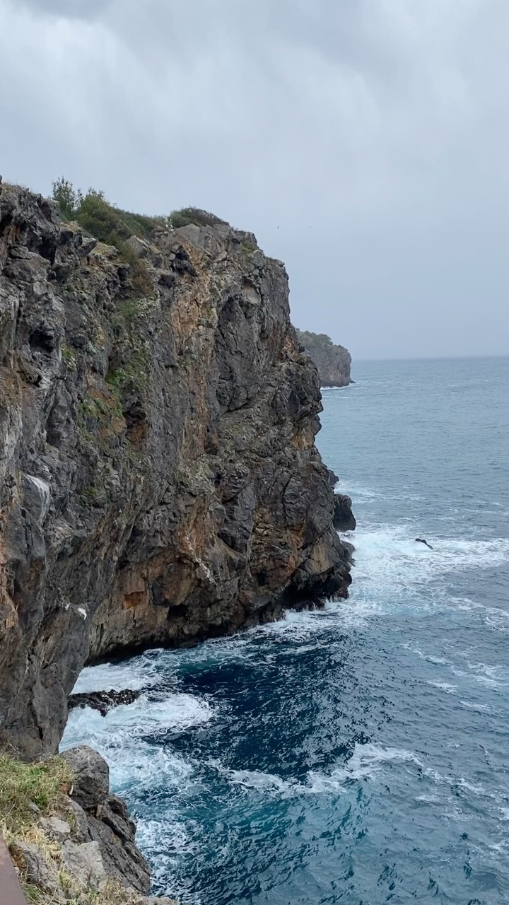 The scene captures a rugged coastal cliff in Mallorca, Spain, where the rocky face meets the restless sea. The cliffside is textured with layers of dark gray and earthy tones, interspersed with patches of greenery clinging to the rock. Below, the ocean is a deep, rich blue, with waves crashing energetically against the base of the cliff, creating white foam that contrasts sharply with the darker water. The sky above is overcast, casting a muted light over the landscape, enhancing the dramatic and serene atmosphere of the coastal setting.