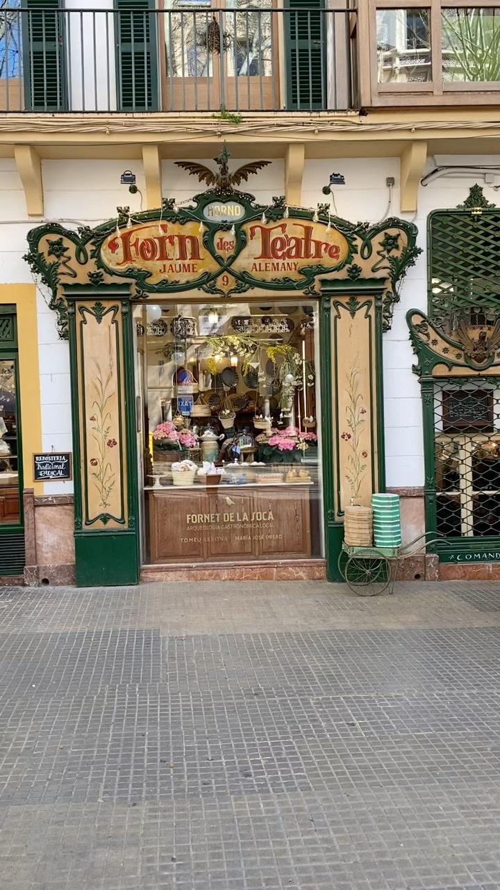 The charming facade of a traditional bakery in Mallorca, Spain, exudes a quaint, old-world charm. The entrance is adorned with ornate, decorative elements painted in rich greens and warm yellows, framing the name of the establishment. Large windows display an inviting array of baked goods, hinting at the delightful aromas within. Above, a small balcony with green shutters adds to the rustic Mediterranean feel. The cobblestone street in front enhances the historical ambiance, inviting passersby to pause and admire the craftsmanship and inviting atmosphere of this local gem.
