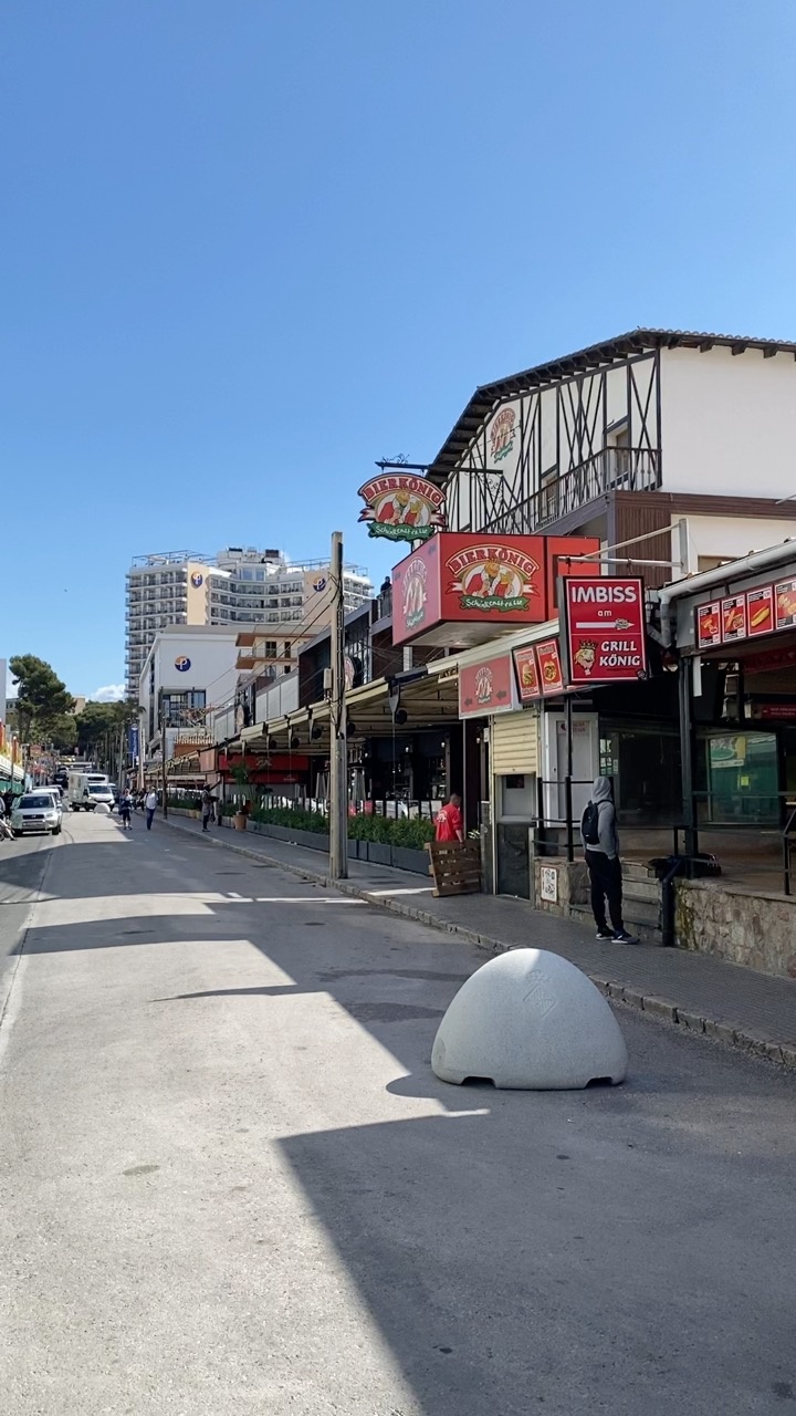 The scene captures a lively street in Mallorca, Spain, bathed in bright sunlight under a clear blue sky. The street is lined with a variety of shops and eateries, their colorful signs and awnings adding vibrancy to the atmosphere. The architecture features a mix of traditional and modern elements, with timber-framed facades and contemporary high-rise buildings visible in the background. People stroll along the sidewalk, enjoying the warm, inviting ambiance typical of a Mediterranean locale. The shadows cast by the buildings and street elements create a dynamic interplay of light and shade, enhancing the street's bustling yet relaxed mood.