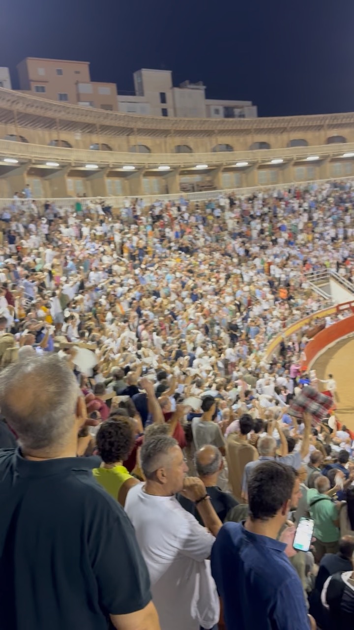 The scene captures a vibrant, bustling crowd seated in a circular arena, their energy palpable under the warm glow of artificial lights against the backdrop of a clear night sky. The architecture is characterized by its traditional, arched design, reminiscent of historic Mediterranean styles, with a series of arches lining the upper tiers. The audience, a diverse mix of people, is animated and engaged, creating a lively and festive atmosphere. The arena's sandy central area hints at events or performances typical of such venues, adding to the cultural richness of the setting. Surrounding buildings, with their flat roofs and muted colors, subtly frame the scene, enhancing the sense of place within the charming island of Mallorca.