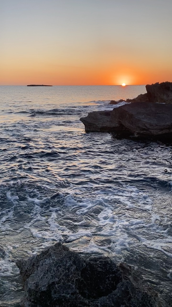 The scene captures a serene sunset over the Mediterranean Sea, with the sun dipping below the horizon, casting a warm, golden glow across the sky. The tranquil waters reflect the vibrant hues, creating a shimmering path of light. Rugged rocky cliffs frame the right side, their textures highlighted by the soft evening light. The gentle waves lap against the shoreline, adding a rhythmic sound to the peaceful ambiance. The distant silhouette of a small island adds depth to the expansive seascape, enhancing the sense of calm and natural beauty typical of Mallorca's coastline.