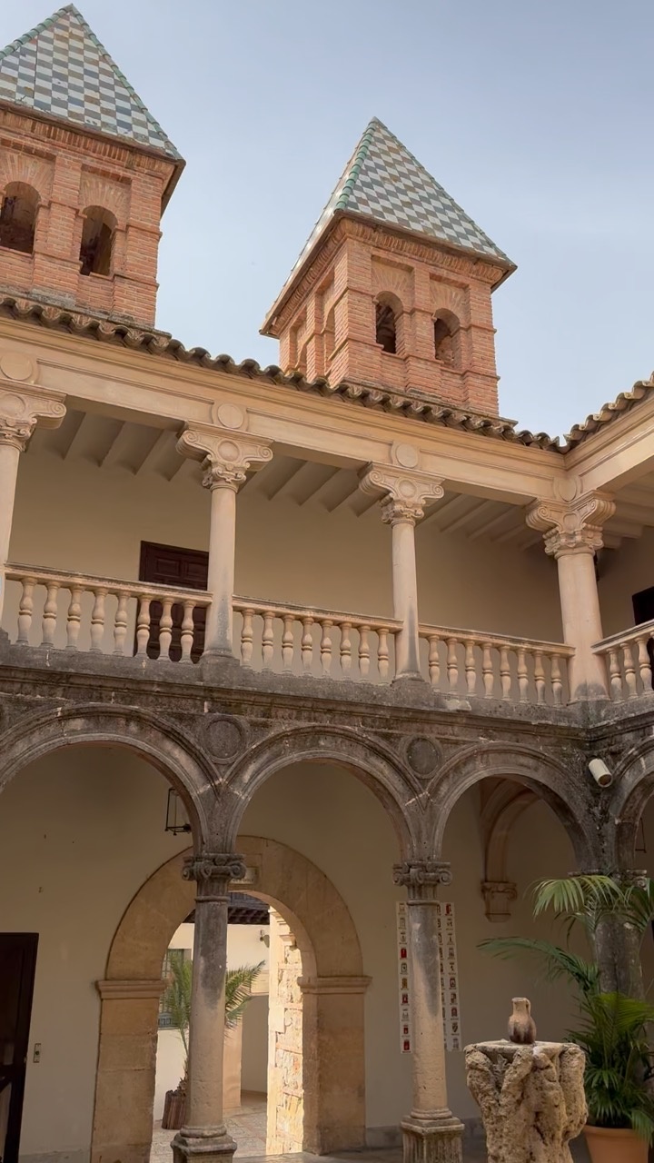 The scene captures a serene courtyard in Mallorca, Spain, characterized by its warm, earthy tones and historical architecture. Two prominent towers with patterned, green-tiled roofs stand against a soft, overcast sky, adding a touch of color and texture to the rustic brickwork. The courtyard is framed by elegant stone arches, each adorned with delicate carvings that speak to the region's rich heritage. Above, a row of classical columns supports an upper balcony with a balustrade, inviting gentle breezes to pass through. The atmosphere is tranquil, with a subtle play of light and shadow enhancing the timeless beauty of the space. A small, lush plant adds a hint of greenery, complementing the natural stone and wood elements present.