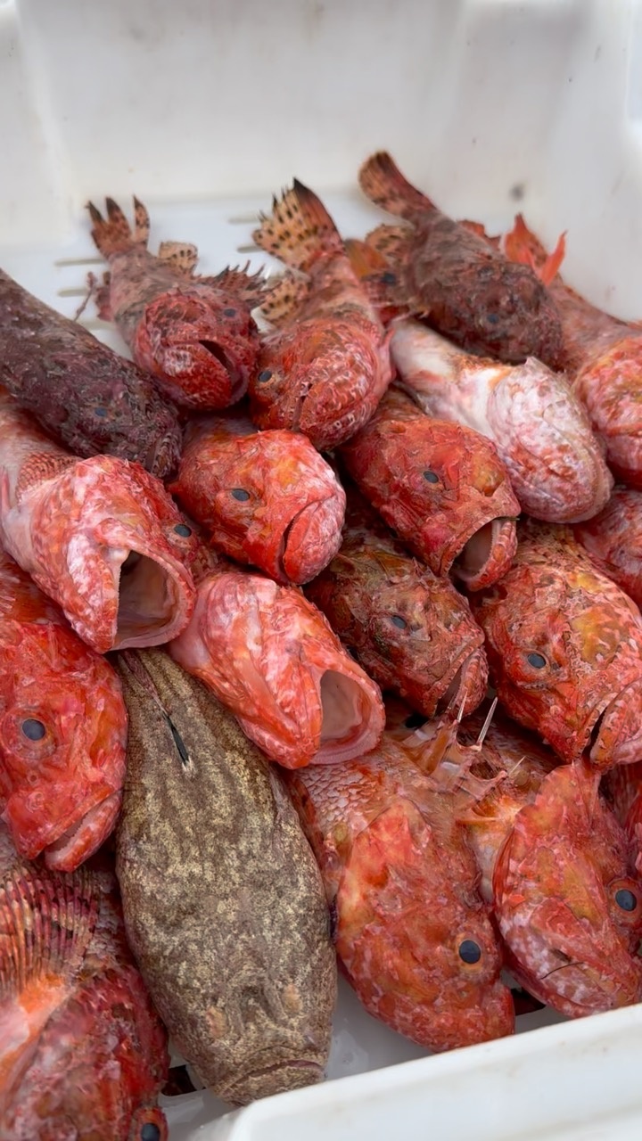 A collection of freshly caught fish, predominantly red in hue, is neatly arranged in a white container. Their scales glisten subtly under the natural light, hinting at the freshness of the catch. The fish exhibit varied textures, with some having spiky fins and others smoother bodies, showcasing the diversity of marine life typical of the Mediterranean waters surrounding Mallorca. The scene evokes a sense of the vibrant fishing culture and the rich maritime heritage of the island, with the vivid colors and intricate details of the fish reflecting the lively atmosphere of a local market.