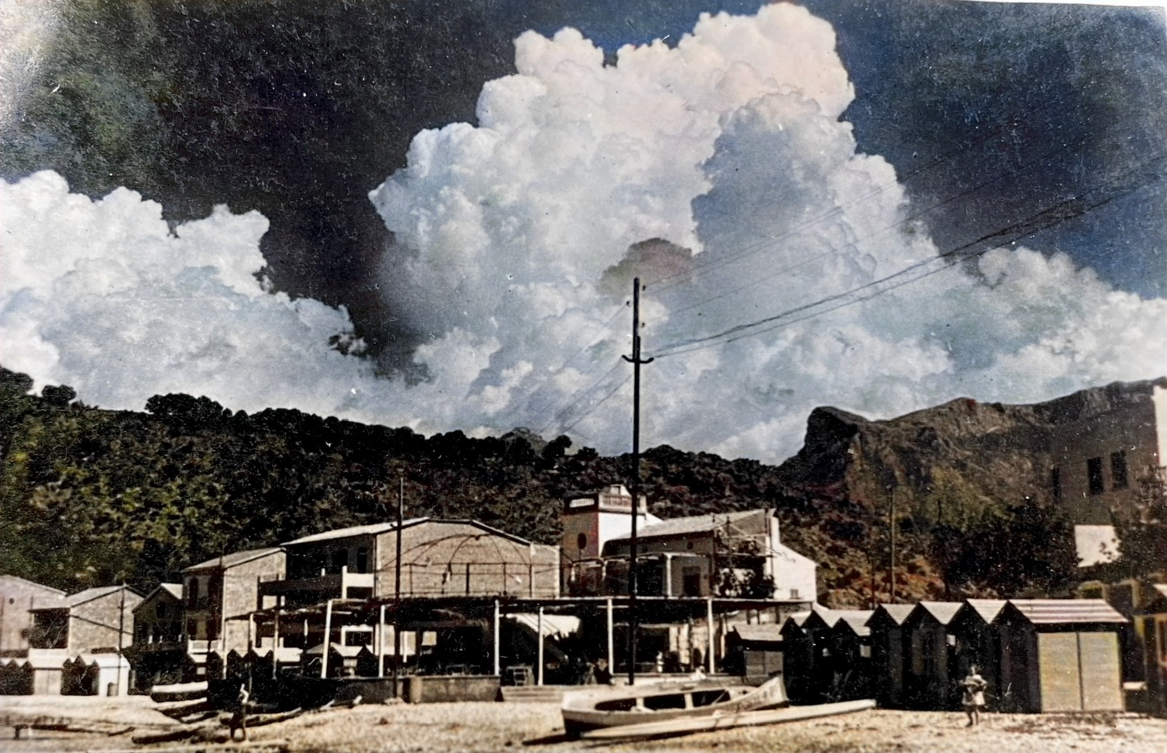 The scene captures a quaint coastal village in Mallorca, Spain, under a dramatic sky filled with towering cumulus clouds. The foreground features a sandy area with a small, moored boat, hinting at a relaxed maritime lifestyle. A row of rustic, wooden beach huts lines the shore, adding a touch of charm. Behind them, a collection of traditional stone buildings with flat roofs and simple facades stands against a backdrop of lush, green hills. The rugged silhouette of the hills contrasts with the soft, billowing clouds, creating a sense of depth and tranquility. The atmosphere is serene, with a gentle play of light and shadow enhancing the textures of the landscape and architecture.